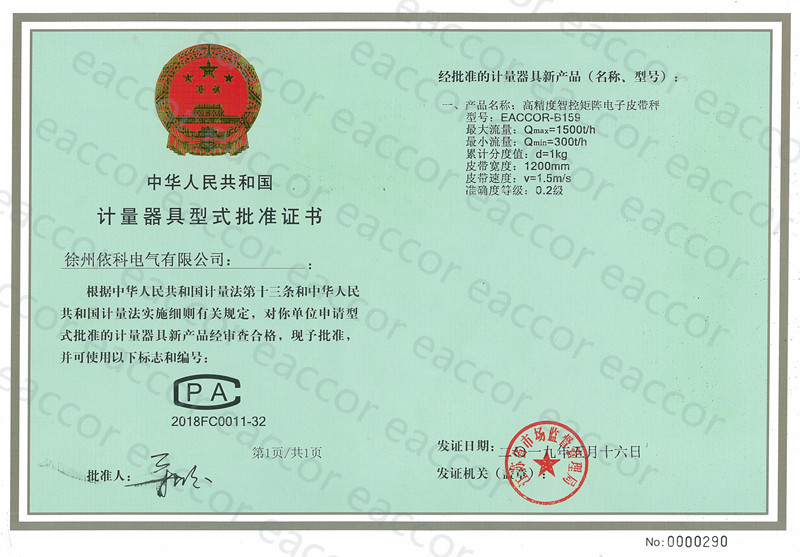 熱烈祝賀徐州依科電氣有限公司專利技術高精度智控矩陣電子皮帶秤EACCOR-B159獲得0.2級計量器具型式批準證書!!!