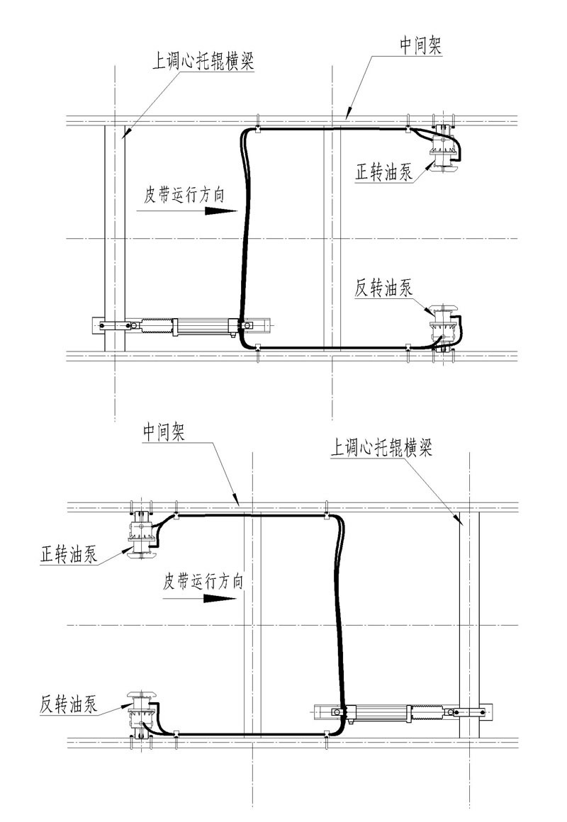 當皮帶居中運行時,皮帶與左右兩只檢測輪不接觸,屬于正常運行。如果皮帶在運行偏左邊時,啟動左動力輸出裝置,執行機構根據邏輯閥判斷調整糾偏托輥位置,產生反向推力,把皮帶推向中間一面。反之,皮帶偏右時,啟動右動力輸出裝置,執行機構根據邏輯閥判斷調整糾偏托輥位置,產生反向推力,把皮帶推向中間一面。